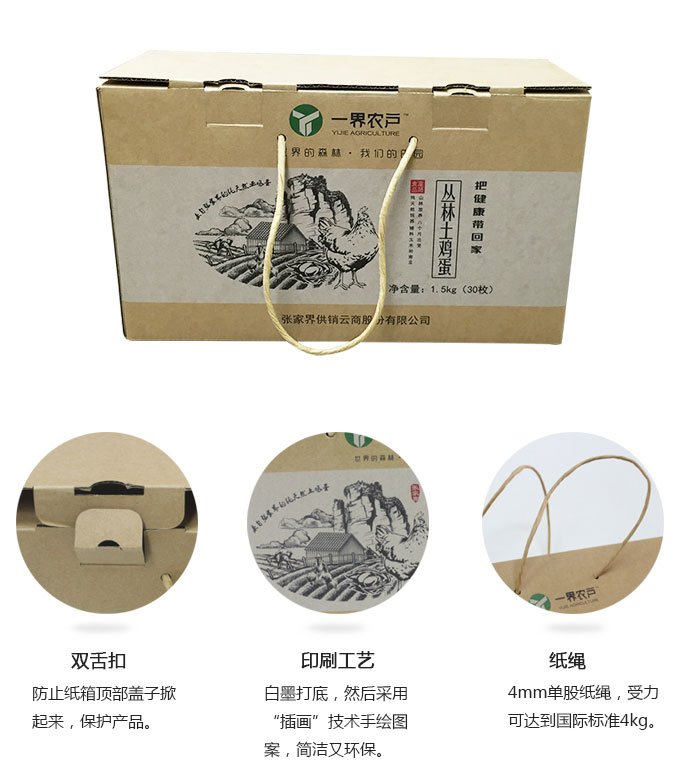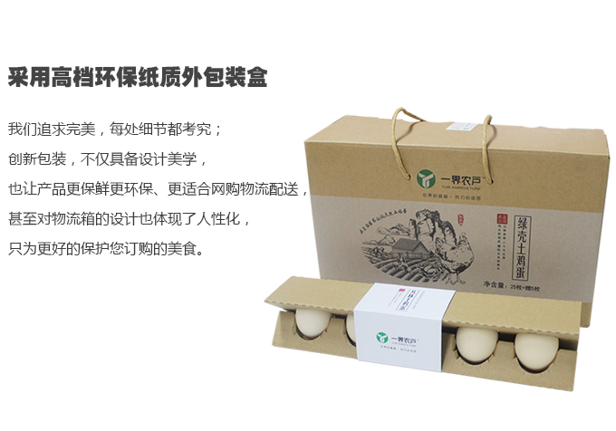 一界農(nóng)戶土雞蛋禮品包裝盒我們追求完美,每處細(xì)節(jié)都考究;創(chuàng)新包裝,不僅具備設(shè)計(jì)美學(xué),也讓產(chǎn)品更保鮮、更環(huán)保、更適合網(wǎng)購物流配送;甚至對(duì)物流箱的設(shè)計(jì)也體現(xiàn)了人性化,只為更好的保護(hù)您訂購的美食。